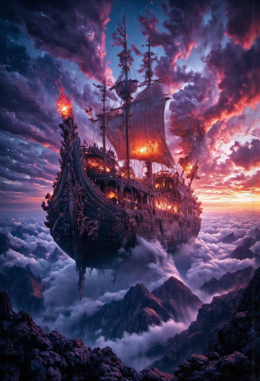 A hyper-realistic portrait, photorealistic photo close-up image of This highly detailed image portrays a majestic, otherworldly ship sailing through a sky filled with vibrant, multicolored clouds. The ship itself is crafted from dark, polished wood, with sails made of shimmering, translucent fabric that glows faintly in the soft, ethereal light. The hull is adorned with intricate carvings of mythical creatures, and at the bow, a large, glowing crystal juts out, guiding the vessel through the sky. The ship is surrounded by swirling clouds, their hues ranging from deep purples and blues to bright oranges and pinks, creating a surreal and dreamlike backdrop. Below the ship, distant mountain peaks poke through the sea of clouds, illuminated by the last light of a setting sun. The atmosphere is one of peaceful wonder, with the ship sailing silently and gracefully through the boundless sky. The level of detail in the wood grain, the glowing sails, and the swirling clouds make the scene feel both realistic and fantastical, as if the ship is a relic from a long-lost era. (photography, high-resolution, dynamic, energetic,hyper-realistic, dramatic lighting, shallow depth of field.), detailmaximizer, MythP0rt<lora:midjourney_whisper_flux_lora_v01:0.55><lora:aidmaMJ6.1-FLUX-V0.1:0.4><lora:FluxMythP0rtr4itStyle:0.4><lora:detailed_flux_ntc:2.2><lora:aidmaImageUpgrader-FLUX-V0.1:0.65>