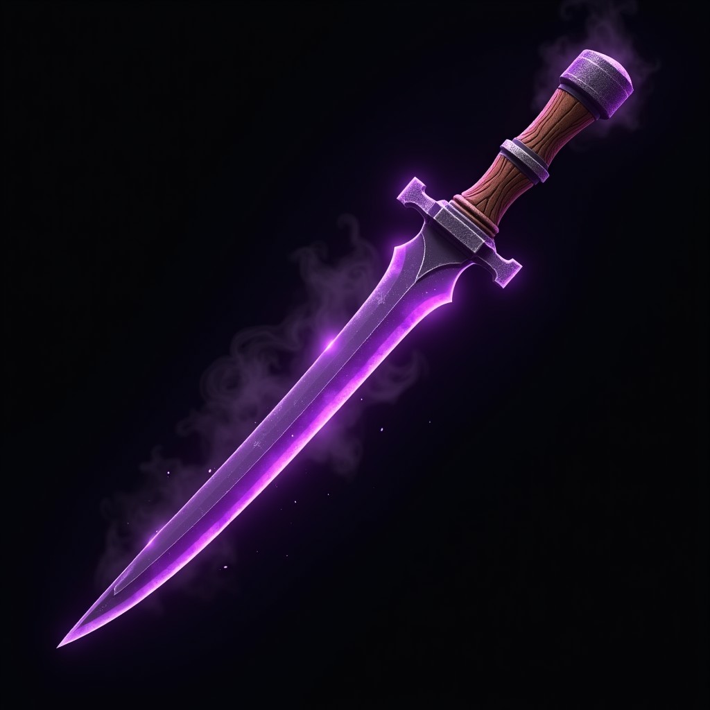 Highly detailed 4K image of a purple single-edged scimitar. With a wooden purple handle. It has a purple glow and a noticeable fog. The background is completely black.