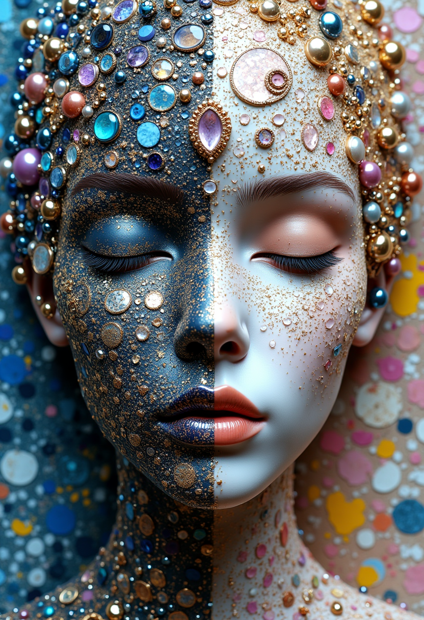 A masterpiece of abstract idol girl style created by the collaboration of Mandalas and Sacred Geometry Artists and Jackson Pollock. The main objects in the image are composed of different materials. The left side of the main object is made of beads or small glass balls, while the right side retains its original material.Imagine a stunning masterpiece that blends elements of abstract idol girl art with intricate mandalas and sacred geometry, interwoven with the dynamic splatter technique pioneered by Jackson Pollock. The central figure in this artwork is an ethereal idol girl, her form emanating a sense of both mystery and grace.The left side of the main object is crafted from a mesmerizing array of beads and small glass balls, arranged in a way that catches light and sparkles like a constellation. Each bead appears to be delicately placed, creating a pattern reminiscent of celestial bodies or intricate mandala designs. The colors range from deep blues and purples to shimmering silver and gold, giving the left side an almost holographic quality.On the right side, the idol girl retains her original material, which could be a smooth, polished stone or a delicate clay texture. This side seems more grounded, with subtle yet elegant patterns that contrast beautifully against the sparkling beads on the left. The textures here might hint at ancient symbols or sacred geometry, adding layers of depth and meaning to the overall composition.The background is a swirling vortex of colors and shapes, reminiscent of Pollock's drip paintings. Splashes of vibrant hues intermingle with more muted tones, creating a dynamic visual flow that connects the left and right sides of the idol girl. The space around her seems almost alive, as if the very essence of creation and chaos are being balanced within this single artwork.This photo would be a breathtaking fusion of traditional and modern art techniques, blending spirituality, geometry, and abstract expressionism into a single, captivating image. HD32K, hyperdetailed, best quality, aidmaMJ6.1.