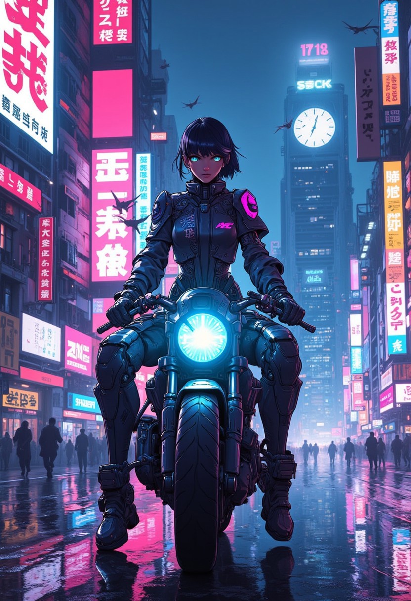 A futuristic female motorcyclist with jet-black hair styled in a pixie cut, her violet eyes glowing softly in the dark. She sits calmly on a sleek, futuristic motorcycle, the machine glowing with bright neon blue and purple accents. Her high-tech, full-body suit is adorned with intricate circuit-like patterns that pulse in sync with the city’s energy. Behind her, the cyberpunk cityscape is alive with towering holographic billboards, some displaying animated ads, others flickering with static. Neon signs hang from towering buildings, casting vibrant hues across rain-soaked streets, while drones zip through the air. In the distance, a massive digital clock on a skyscraper counts down ominously, adding to the tension of this futuristic world. The atmosphere is both electric and ominous, reflecting a bustling yet dangerous city at night.