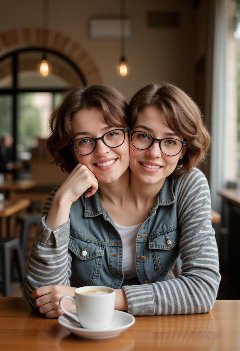 c0nj01nd, Side view photo of a young woman sitting at a table in a coffee shop. She is a conjoined twin with two heads. She has short brown curly hair. She has thick rimmed glasses. She is of French ethnicity. She is smiling shily at the camera.