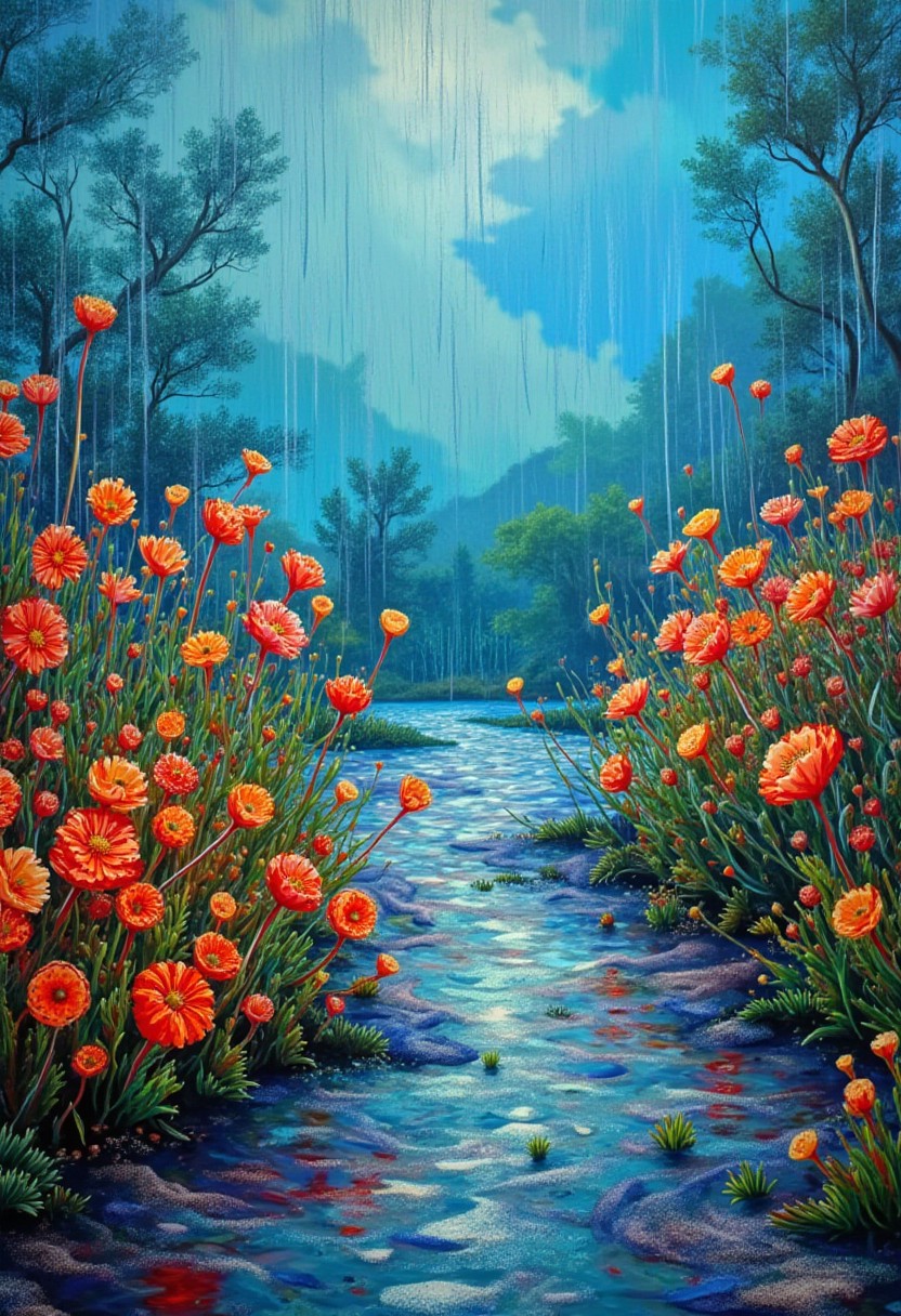 shenhai, liquid particles glowing, plants and flowers, a complex expressive expressionism oil painting of a raining country landscape weather. the painting looks wet like the raining is coming out of the painting, Abstract art