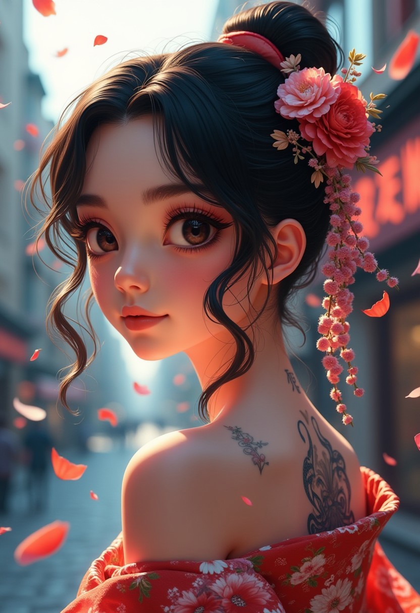 Japanese teenage art1fact girl, floral kimono, exposed shoulders, from behind, beautiful face, thick eyelashes, glossy eyes, black hair, (cute smile), dark eyeshadow, shoulders tattoos, back tattoos, floral decoration in hair, falling petals, beautifully backlit, full body visible, big city background,photo, raw,realistic