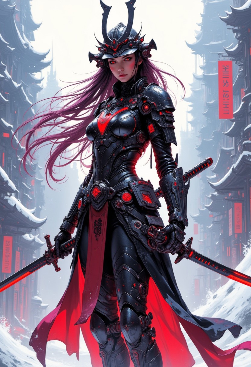 cyberpunk anime style, a stunning japanese female warrior, long flowing hair, wearing samurai armour and helmet, holding a katana with both hands on a snowy battlefield, theme in neon, red and black colour, high quality, highly detailed