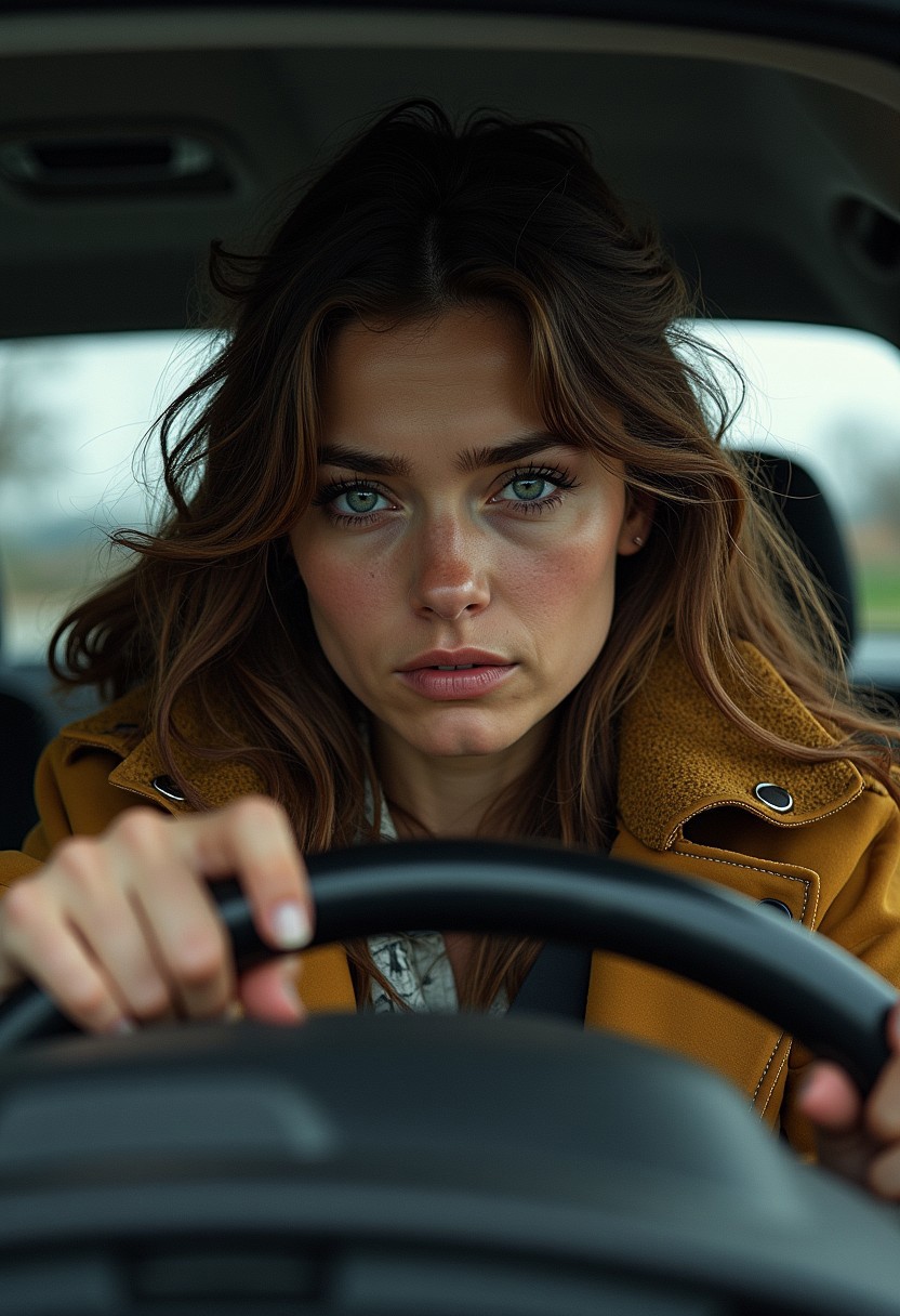 f4nt4st1c, (a view from inside the car (a young female detective driving car. She is holding the storing wheel with one hand. Another hand is touching her forehead. She looks sad and determined))