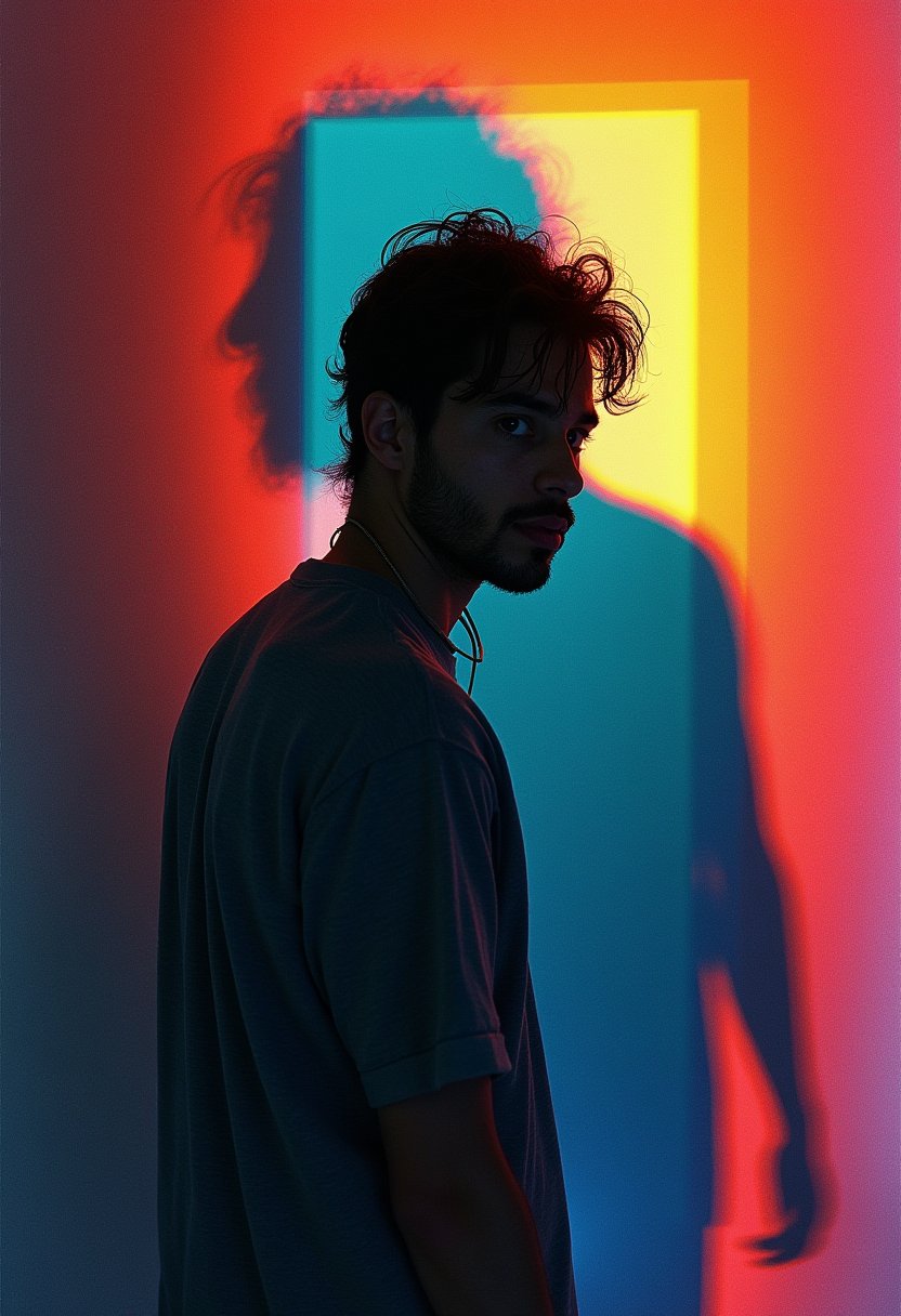 In this stunning and captivating image, the theme of shadows is portrayed with an intense, artful style that leaves a lasting impression on the viewer. The use of watercolor adds depth and texture, creating an unforgettable visual experience. The Split Tone technique further enhances the contrast and drama of the scene, making it stand out.The photo itself is a candid shot that captures the essence of the subject's movement, providing a raw and authentic feel. The integration of Neon Light in the background adds a modern and dynamic element to the composition, while also referencing the bold and striking colors of Fauvism in the works of Henri Matisse. ,