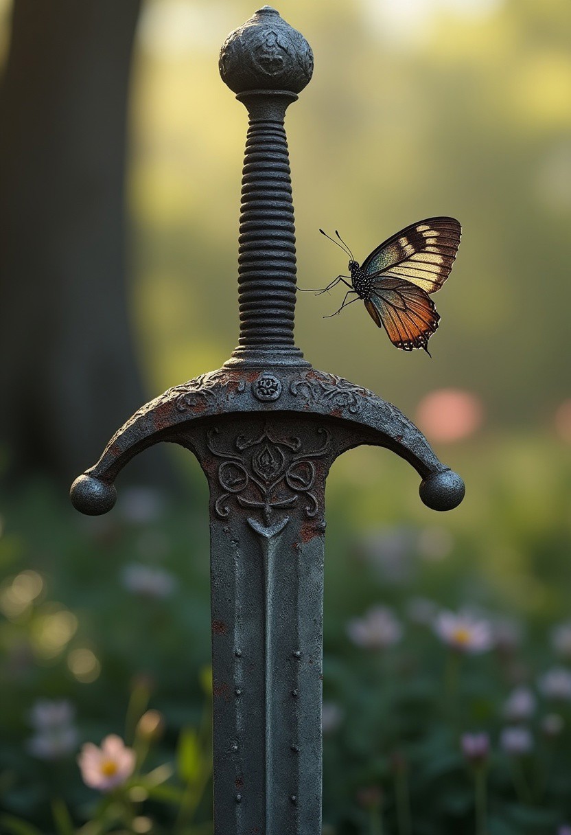 A realistic scene of a small, fragile butterfly perched on the hilt of a massive medieval sword. The butterfly's wings sparkle with iridescence, flapping gently as it hovers in the air, balancing with the huge weapon. The sword is ancient, covered in intricate engravings and partially rusted, which contrasts with the fragility of the butterfly. In the background is a blurred garden with soft sunlight. This contrast of strength and fragility creates a surreal and thought-provoking image.