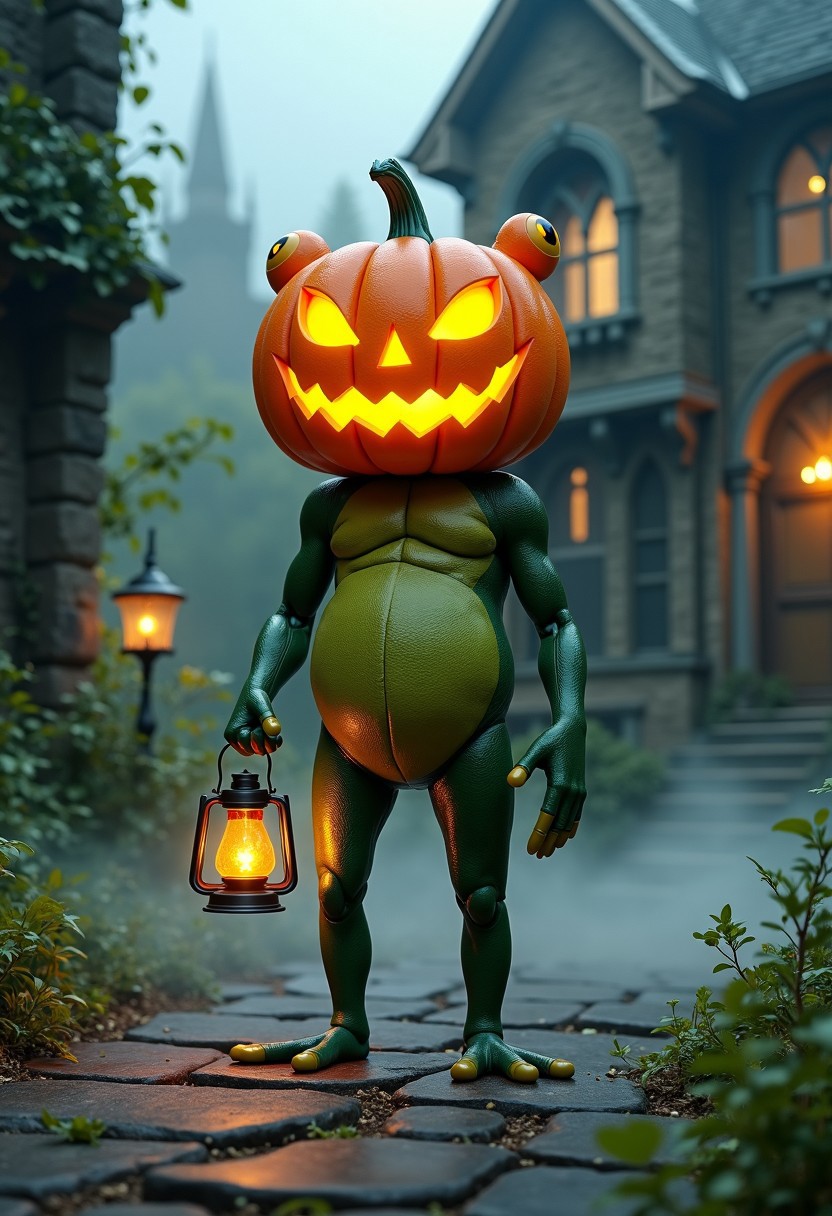 A humanoid frog standing on two legs, wearing a glowing jack-o'-lantern on its head. The pumpkin's yellow light shines brightly, casting an eerie glow over the frog's green, textured skin. The frog stands closer to the viewer, its wide eyes peeking from beneath the pumpkin, and it holds a small lantern in one hand. The misty courtyard of a mystical mansion surrounds the frog, with fog swirling around its feet. The ancient mansion, shrouded in shadows and ivy, looms in the background, adding to the haunting, mysterious atmosphere