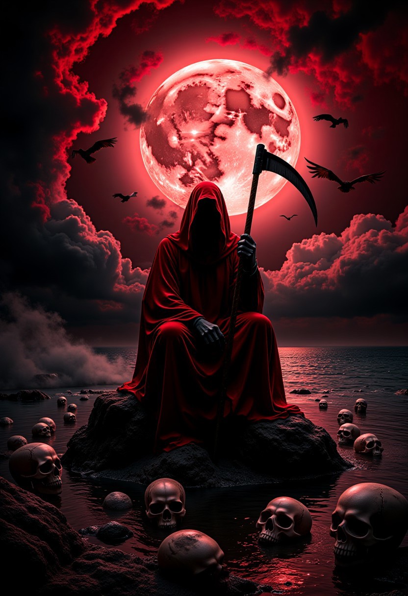 A grim reaper in a flowing red robe sits on a rocky outcrop by a body of water, holding a massive scythe. face is hidden, adding to the mystery. A massive full moon with a reddish glow illuminates the scene, casting eerie light across swirling red and black clouds. The moonlight reflects off the water, disturbed by sea of floating human skulls. Birds fly toward the moon, adding movement. The image is rich in contrast with dramatic lighting, enhancing the dark, foreboding atmosphere,