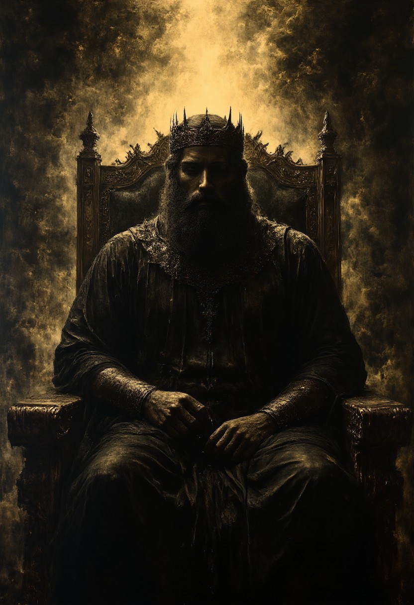in the shadows dark silhouette with golden crown on a dark throne, only huge ornate intricate bright golden crown shines, beard undistinguishable face silhouette posture is very dominant sitting on the throne, view from below, golden glow fills the whole picture, intricate golden glow all over the crown, dark skies above the throne, earie atmosphere endorses the mystery. masterpiece, artsy, highly detailed