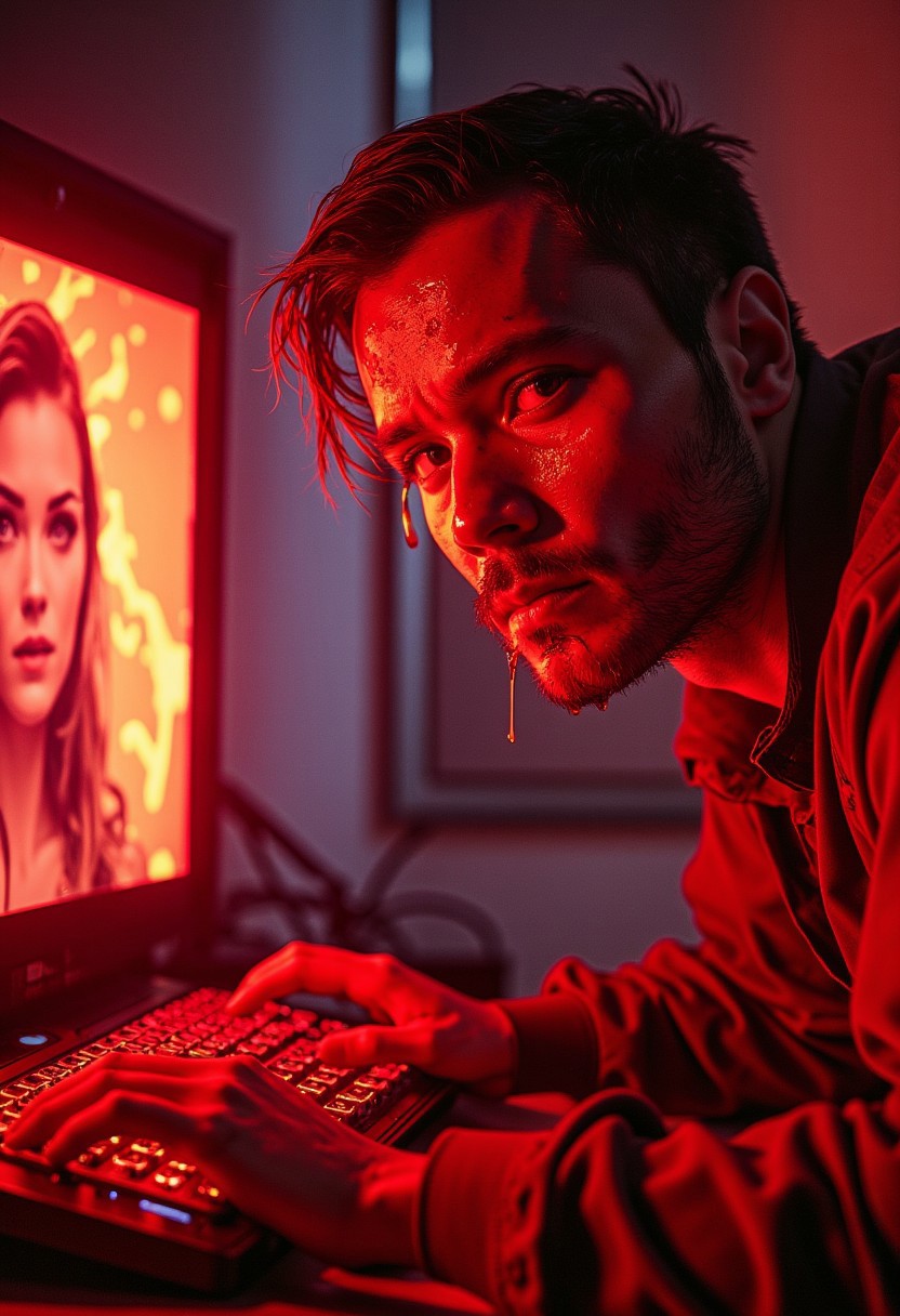 man in front of a computer screen, red hot glowing PC case, glowing heated up PC components, attractive nubile girl portrait on pc screen, A very sweaty man, dripping sweat, fire particles flicker and glow, looking at viewer, High Detail, Perfect Composition, movie scenes, highly detailed. Photorealistic rendering, dramatic lighting, sharp contrast, red color palette, text on image, text visible on image, image with text, text at the top 'ITS GETTING COLD, TIME TO START HEATING'