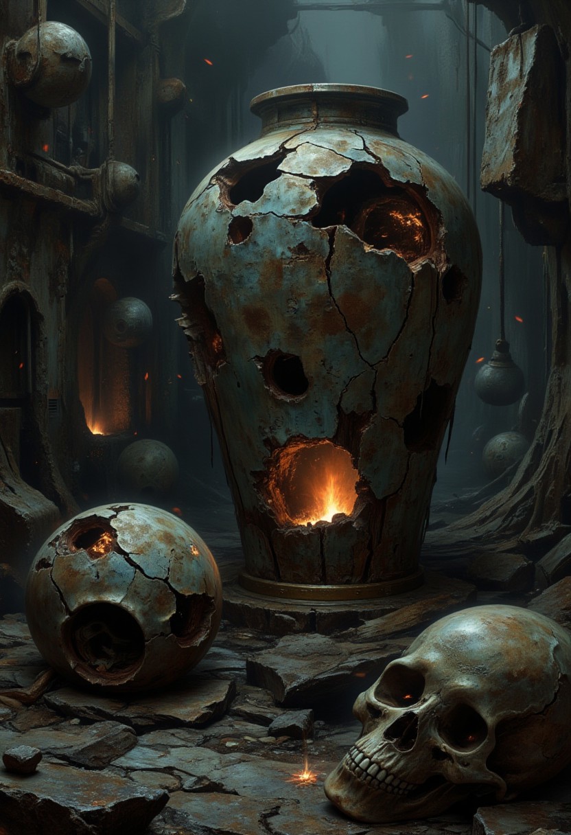 d1eselc0re, dieselpunk, science fiction, scenery, DarkAtmosCE style, high-contrast palette, highly detailed, cinematic quality, modern art photograph, high-contrast palette, timeless feeling, cinematic quality, modern art photograph || Porcelain cracks beneath the weight, Rotting flesh in slow decay, Flies and maggots find their way, Balance of life in disarray, Once a vessel of life, Now holds the fading night, Shattered dreams in endless flight, Colors gone from dark to light, Maggots swarm in sad parade, Round the flesh where light has strayed, Echoes of what once was made, In the vessel where life decayed, Banished scents of sweeter days, Lost in time's destructive maze, Flesh and bone in slow malaise, Silent witness to their phase, Cracks reflect the tales they weave, Stories that we can't believe, Nature's hand we can't deceive, From its clutches, None reprieve, Maggots swarm in sad parade, Round the flesh where light has strayed, Echoes of what once was made, In the vessel where life decayed,