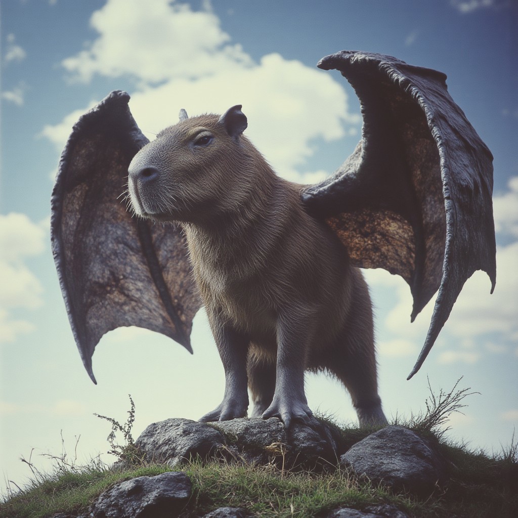 ArsMovieStill, 80s Fantasy Movie Still, A giant capybara with bat wings, capybara dragon hybrid, it stands menacingly on a hilltop