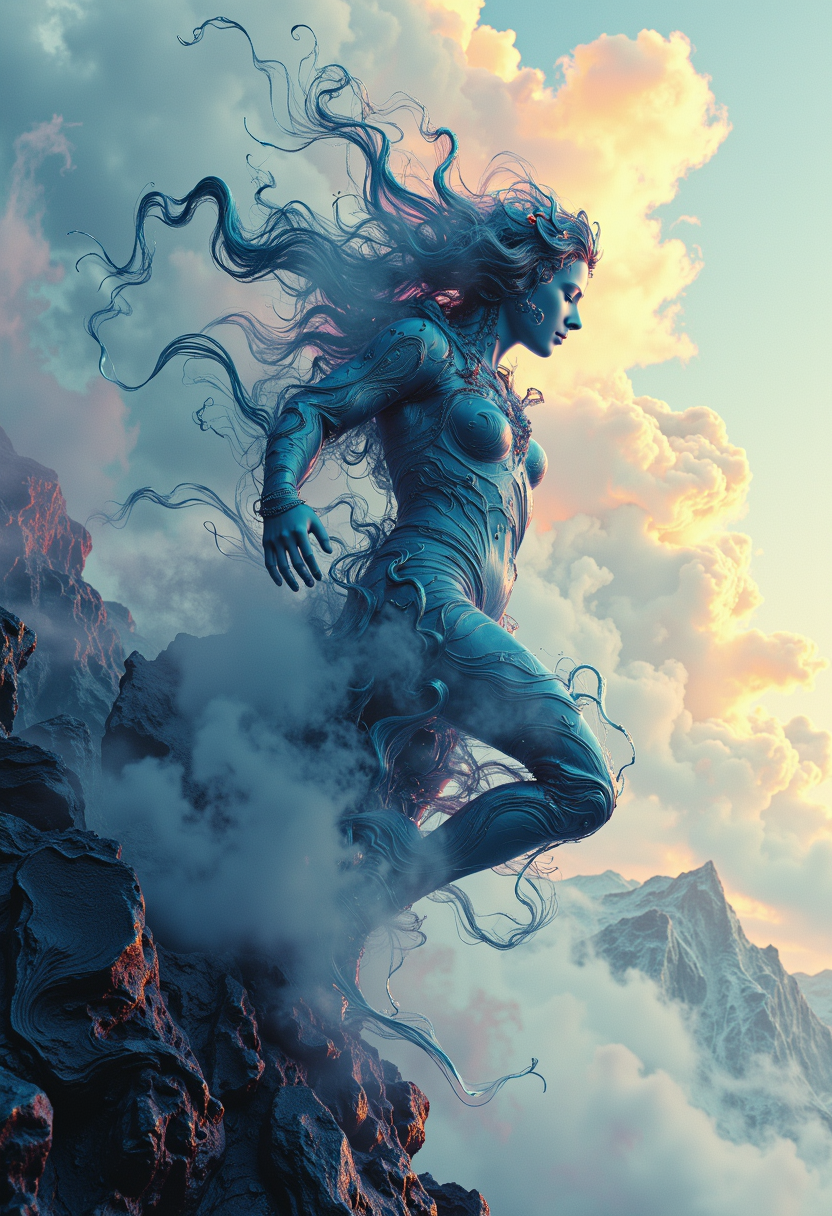 Impressionist digital sculpture of a wind shepherd, body forming from swirling air currents, herding clouds across mountain peaks, dynamic brushstrokes creating a sense of constant motion, cool blues and grays with warm sunlight breaking through
