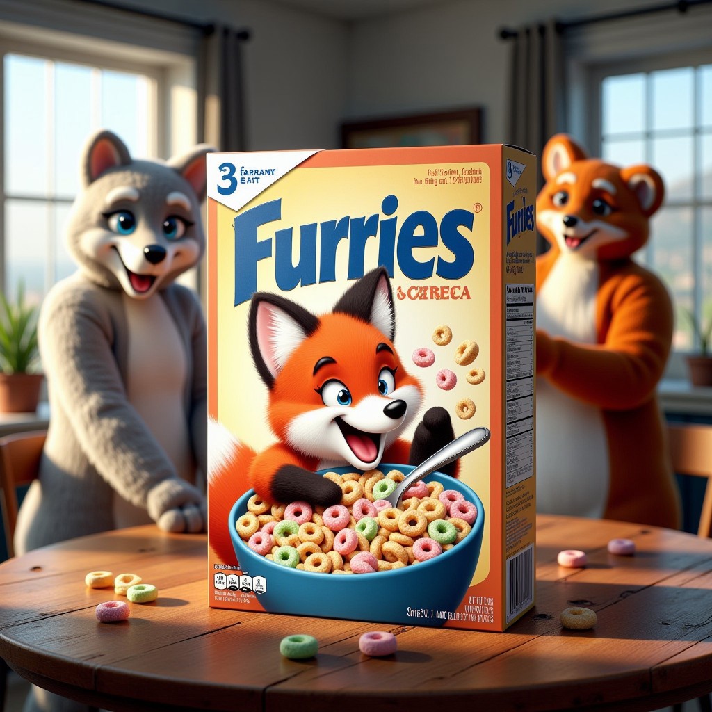 The image is a high-quality photograph showcasing a box of "Furries" cereal. The illustration on the box is furry art of an anthropomorphic fox lactating into a bowl of cereal with animal-shaped marshmallows. The box is displayed on a table in a dining room. There are two characters wearing fursuits cavorting in the background.