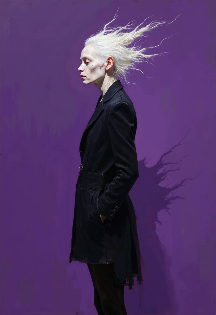 DB4RZ style painting She was beautiful, gaunt and elegant. Her face was long and pale, her eyes were pale, small and close beside her long nose; she had prominent front teeth; her hair was an unruly shock of white tufts. She habitually wore a tight and threadbare suit of black twill with black stockings and black shoes, in unkind contrast to her pale skin and white hair. Her arms and legs were lank. She projected authority, a fierce character, unfilled love promises and a deep love of the past. • purple background, high contrast, deep shadows, surreal, aidmaMJ6.1
