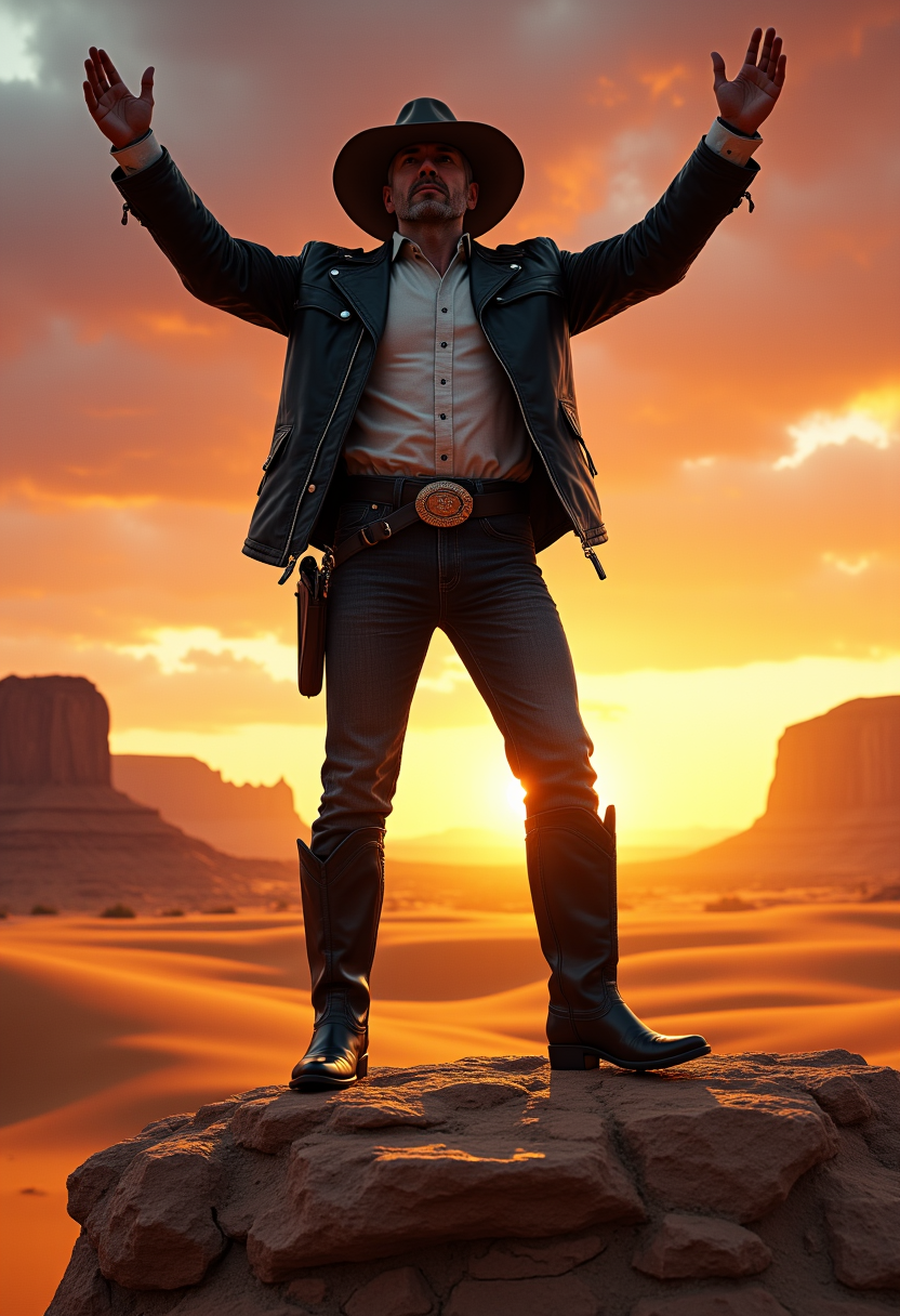 A masterpiece of cowboy style created by the collaboration of H.R. Giger and Nicolas Poussin. Imagine a wide-angle shot captured from a low vantage point, looking up at the cowboy. The scene is set in an expansive, sun-drenched desert with golden sand dunes stretching into the horizon under a vibrant sunset sky. The cowboy stands confidently on a rocky outcropping, his back slightly arched as if he's about to leap into action.He is dressed in classic Western attire: a well-worn black leather jacket over a crisp white shirt, paired with a wide-brimmed, sun-faded hat that partially obscures his face. His arms are extended outward in a bold, dramatic pose, hands clasped together at the wrist and held high above his head, as if he's commanding an unseen audience or perhaps the elements themselves.The cowboy’s boots, polished to a shine by years of wear, point directly towards the viewer, emphasizing his stance. The angle is such that we see his legs in profile, with one foot slightly turned outwards, creating tension and movement in the pose.In the background, there are faint silhouettes of mountains on the horizon, their sharp outlines cutting through the warm hues of the setting sun. The sky above is a blend of deep oranges and pinks, with streaks of crimson that add drama to the scene.The lighting is golden hour, casting long shadows from the setting sun, which highlights every texture in the desert landscape, from the rough rock formations to the soft sands below. This low-angle perspective not only emphasizes the cowboy's height but also makes him appear almost like a silhouette against the dramatic sky, creating an awe-inspiring and visually impactful image. HD32K, hyperdetailed, best quality, aidmaMJ6.1.