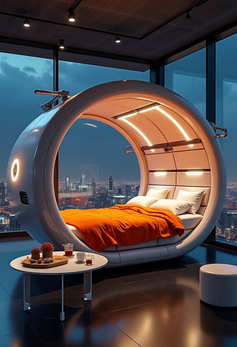 OBweilai, A futuristic bedroom featuring a large, pod-like bed enclosed in a circular metallic and glass structure with integrated technological components and mechanical arms. The bed is covered with bright orange blankets and white pillows, creating a cozy contrast against the high-tech frame. The pod is illuminated by soft, warm lights. A small white table in front of the bed holds a tray with tea, a vase of flowers, and decorative items, while a white stool is positioned near the foot of the bed. The room has a dark metalic floor, and large windows offer a view of a city skyline at night, with twinkling lights in the background. The setting evokes a sense of futuristic luxury, blending advanced technology with comfort and a warm, inviting atmosphere <lora:OB生态技术未来主义:1>