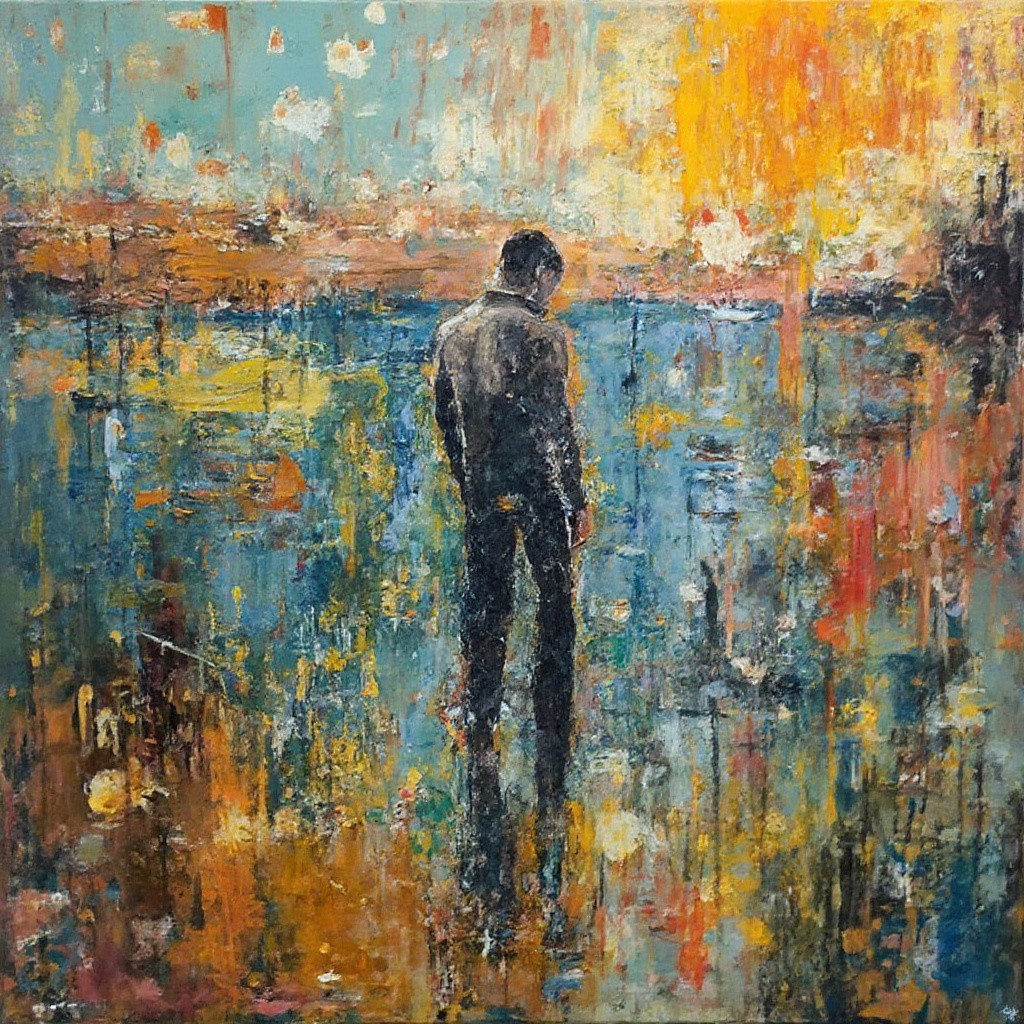 Abstract expressionist painting by Linda Vallejo, Richard Diebenkorn, Jackson Pollock. Thick impasto. Loose, gestural brushwork. Wide, rough brush strokes, Abstract. Abstract expressionism. Vibrant colors. No detail. Gestures in paint towards an abstract masculine figure in an abstract California landscape.