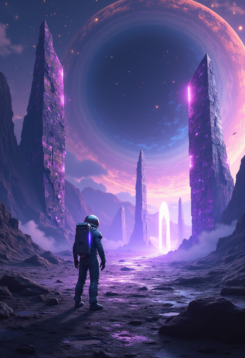 Imagine a vast, otherworldly landscape in a sci-fi setting—a desolate planet orbiting a distant, swirling black hole. The sky is not blue but a deep, inky purple speckled with glowing orbs of strange, alien energy. Towering structures made of iridescent, metallic glass rise from the ground like futuristic crystals, their surfaces reflecting and refracting the light in dazzling patterns. In the foreground, a lone astronaut, dressed in a sleek, aerodynamic space suit, stands with one hand extended towards a nearby glowing portal that seems to lead into another dimension. The scene is bathed in an ethereal glow, enhancing the sense of otherworldliness and wonder. HD32K, hyperdetailed, best quality, aidmaMJ6.1.