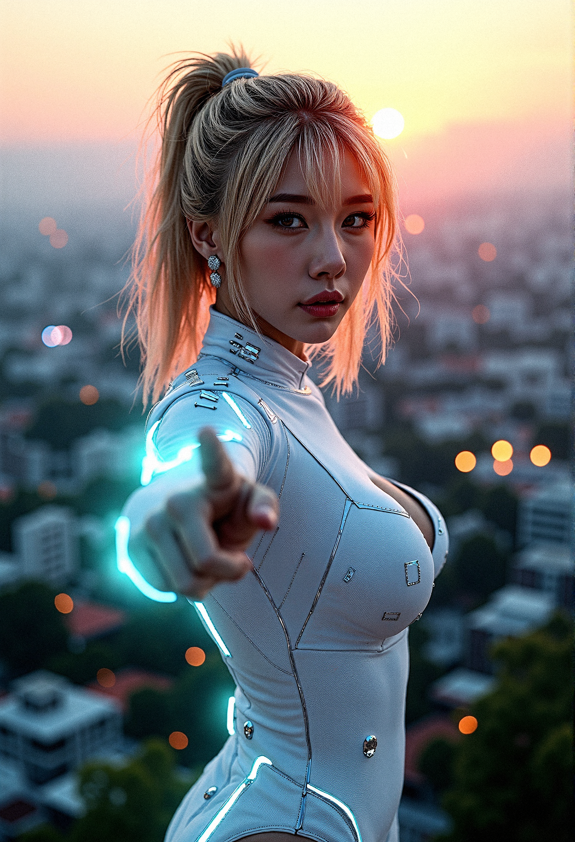 A hyperrealistic image, As the sun sets on a futuristic city, a woman in a glowing white bodysuit on top of the sprawling metropolis filled with greenery and shimmering buildings, her blonde hair illuminated by the ambient light. Soft glow of her hair, capturing the evening light.Colorful lens distortions, emphasizing the futuristic tech.Reflective material on parts of the suit, amplifying the surrounding light. Geometric patterns embedded into the fabric, giving it a high-tech appearance. Smooth, metallic-textured panels on her shoulders, enhancing the futuristic design. Soft luminescent aura, emitting from parts of her suit as if it’s alive with energy. Pointing towards the viewer with a confident, almost challenging expression.