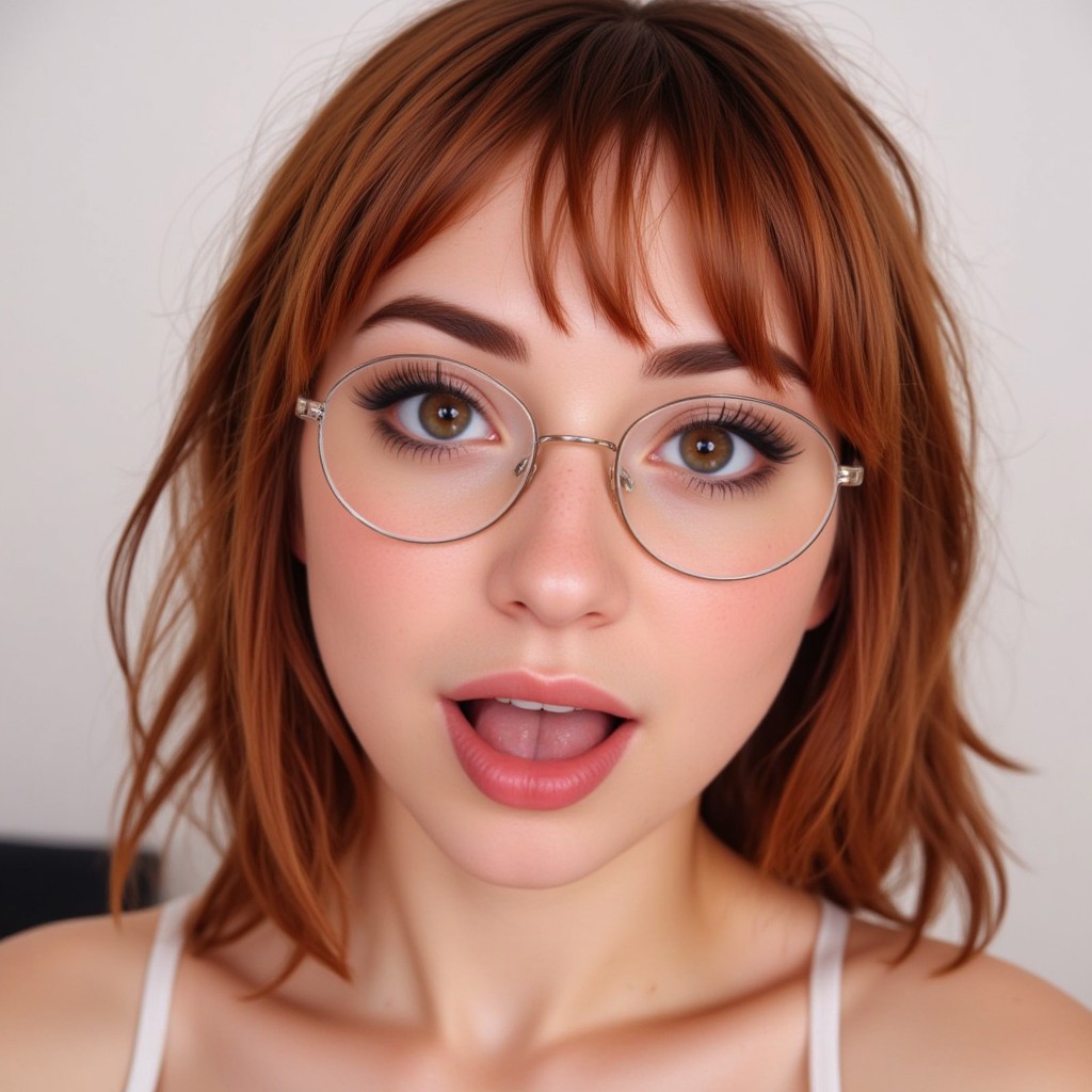 thick eyelashes that are naturally curled., a striking shade of hazel, friendly expression. She has a fair complexion and a light dusting of freckles across her cheeks and nose. Her hair is a medium red color, likely of brazilian girl, almond-shaped hazel eyes with a hint of green and brown, and a slightly upturned mouth with her tongue playfully sticking out. Her eyes are large and almond-shaped, vintage style., tousled waves that frame her face