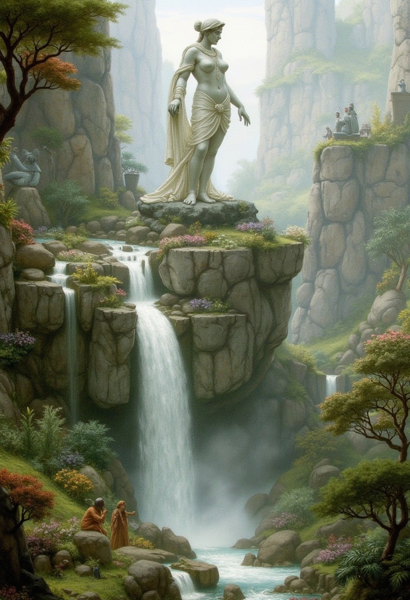 19th century Victorian oil painting by Ernest Normand of a lush alien world, there is a gigantic full body (marble granite statue of a goddess) standing in a heroic pose, the statue is high up on a cliff in the middle of a waterfall with water spilling down on either side of the statue.