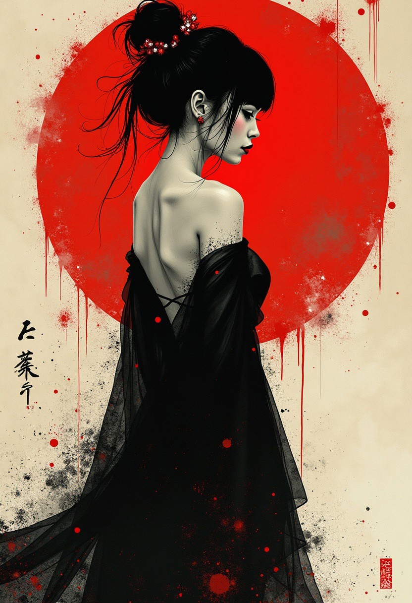 poster art. stunning beauty japanese woman. Girl poses looking back. ink, abstract, punk collage, (random textures, random graffiti, kanji characters, glitch effect:1.2). surrealism, Expressionism. Impermanence. (intricate details, masterpiece, best quality:1.1). full body, red and black color palette. soft lighting. by Franz Marc and Max Ernst. lyh_niji.