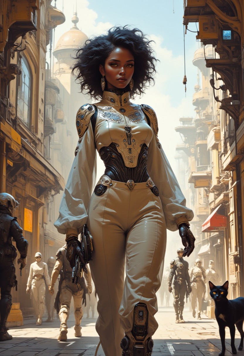 A digital portrait painting of a futuristic woman with dark skin and amber eyes wearing a modest embroidered tunic and trousers in the market square, exotic futuristic architecture with a large window, intricate detail, ambient light, cat, afrofuturistic mythp0rt