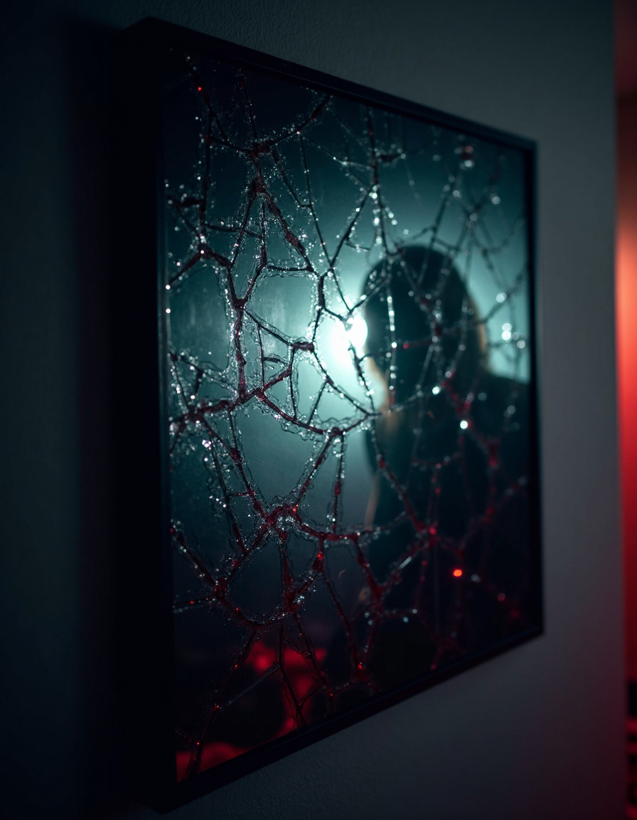 Create a panel of broken glass placed on a wall, where the light from a single source bounces off the sharp edges, creating a terrifying, kaleidoscopic effect, The scene behind the glass should be dramatic and unsettling, Use vibrant lighting to make the reflections appear even more unsettling, The color palette should include dark, deep purples and greens with splashes of bright reds and yellows, , (&:0)