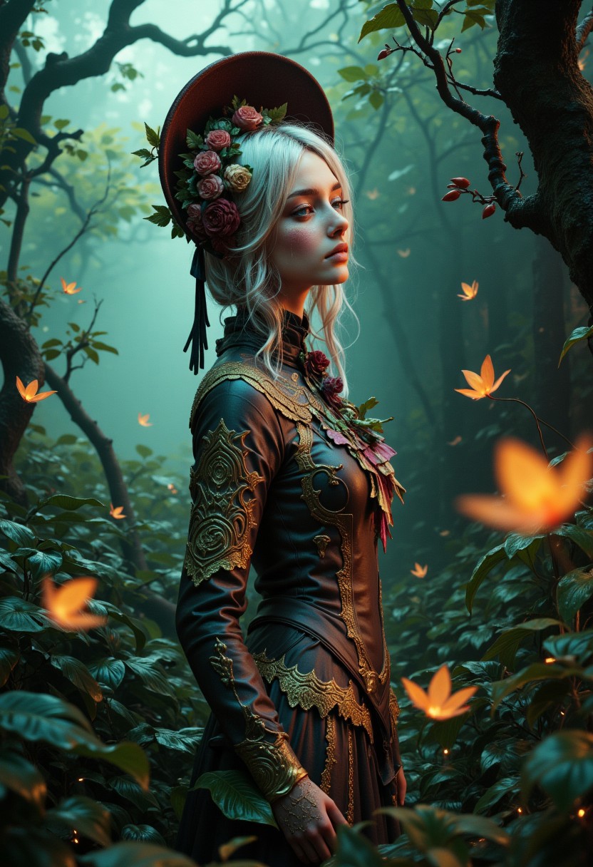 Digital art full body portrait of PlainD0ll, vines and flowers growing from skin, surrounded by a swarm of bioluminescent insects, in a bioluminescent forest clearing, ethereal backlighting, rich emerald and amber color palette