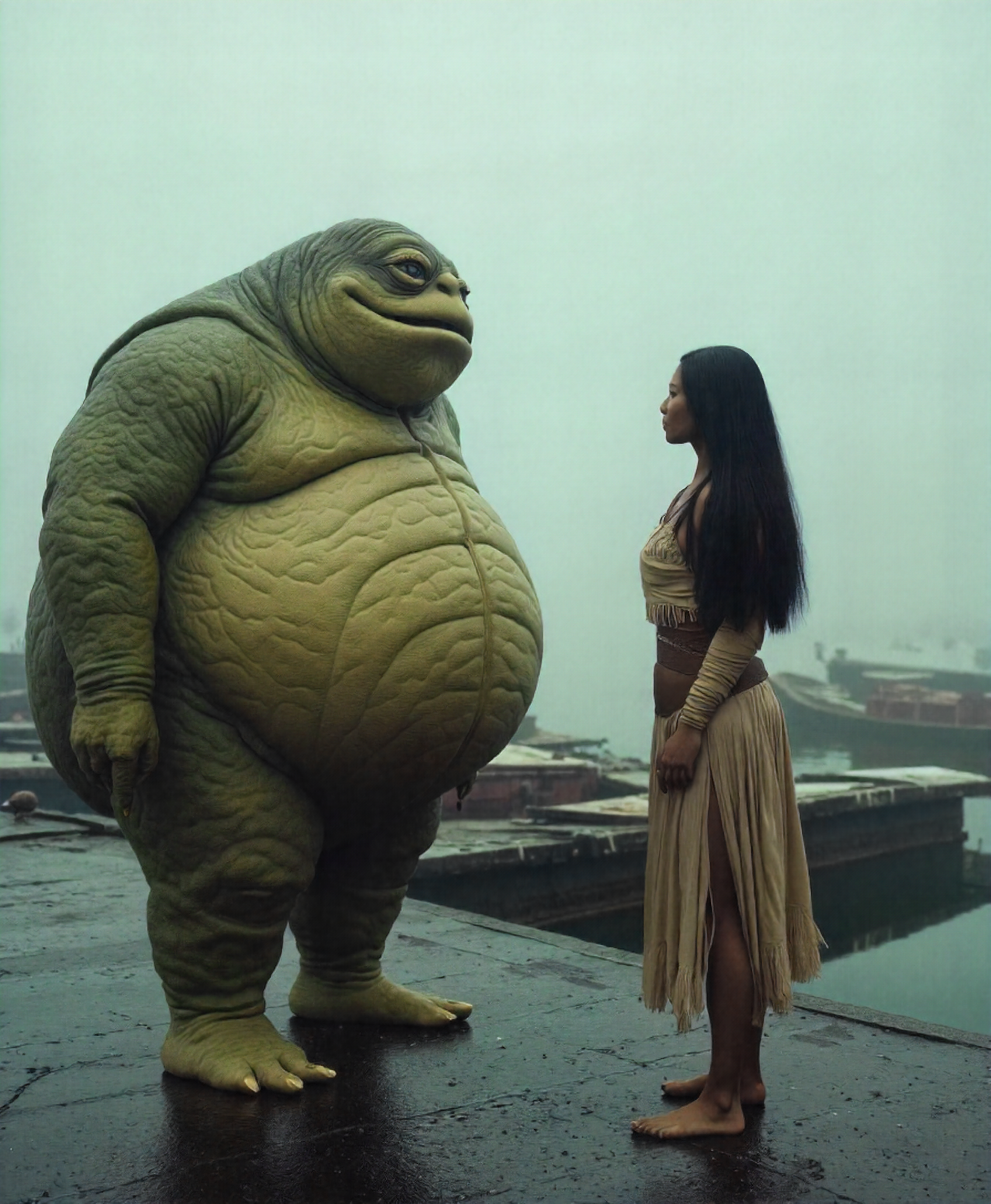 a candid real-life action shot photograph with lifelike motion, realistic lighting, and precise anatomical proportions,of two characters in a scene together, the characters are cliche and recognizable ,BREAK, , Jabba the Hutt from Star Wars, large slug-like, crime lord, greedy, villainous, and Pocahontas from Disney, Native American, long black hair, brave, nature lover, , one is competing in a quiz against the other, ,on a foggy dock with moored boats and seagulls
