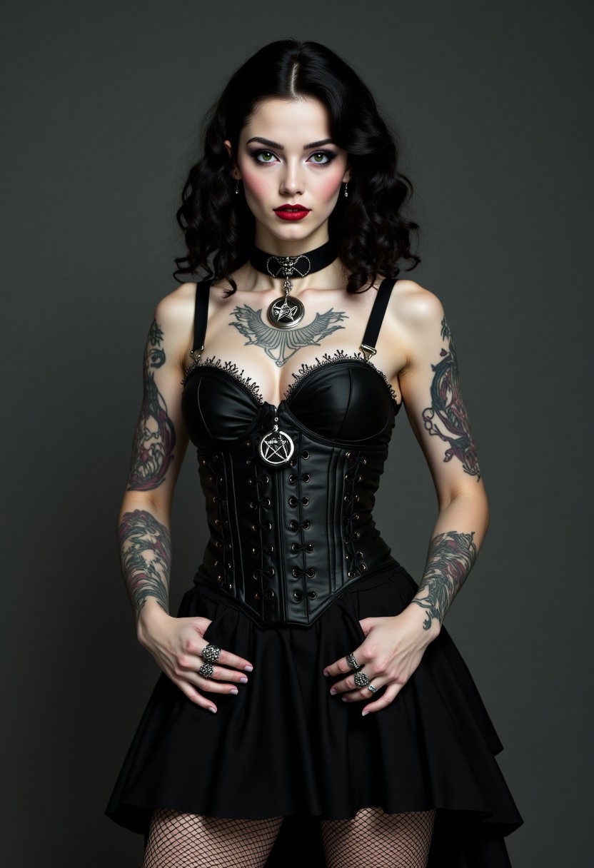 Lila Nightshade is a striking figure, standing at a slight 5'2" with a slender yet athletic build that seems to defy the gravity of her world. Her skin is the palest shade of ivory, a canvas for the intricate, gothic tattoos that weave across her arms and neck, hinting at a fiery spirit beneath the surface. Her eyes are pools of emerald green, framed by thick lashes and dramatically lined with kohl that extends into sharp wings that accentuate the sharp angles of her face. Her hair, a cascade of raven-black curls, falls just below her shoulders, often adorned with small, macabre trinkets that shimmer under the moonlight. Her attire is a fusion of modern goth fashion with a touch of the 9th century, consisting of a corseted black dress that stops just above her knees, revealing fishnet stockings and combat boots that have seen their fair share of battles. A choker with a silver pentacle rests against her collarbone, and her fingers are adorned with silver rings, each one bearing a unique symbol of protection or power.
