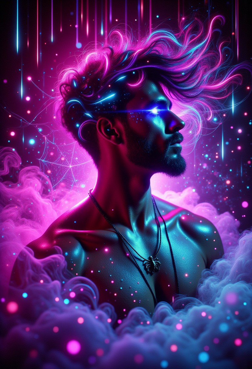 Cyberpunk_halloween, dreamstar, A close-up of a shirtless male character showing head and shoulders, looking sideways. His neon-accented hair glows with vibrant highlights through heavy fog. His face and hair are partially obscured, creating a mysterious, eerie vibe. The background features a faint glowing neon spider web and glitching particles, with the entire scene wrapped in a spooky, holographic Halloween atmosphere.