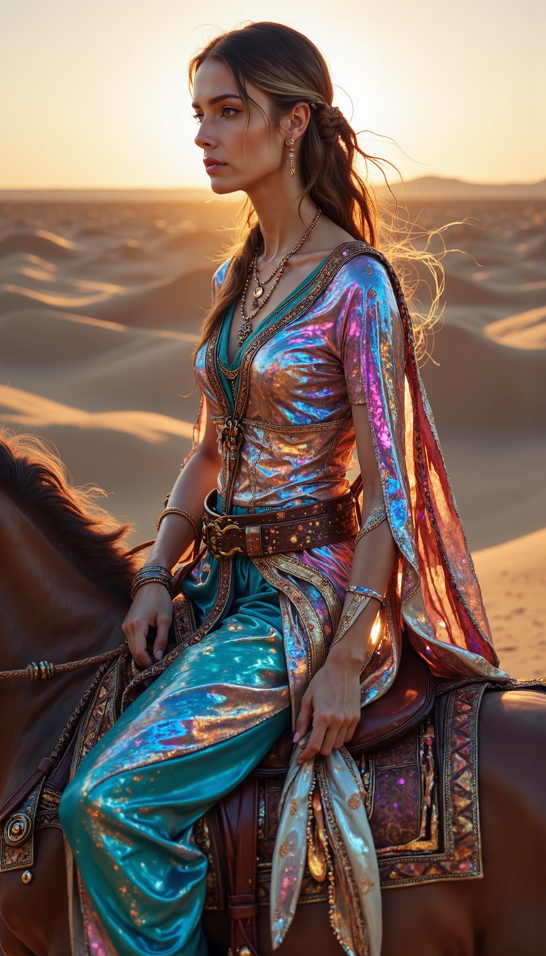 Bioluminescent,evangsurreal,surrealism,glitter, A woman, swathed in a meticulously detailed, richly-hued, nomadic garb, sits astride a horse, her gaze resolute and directed off-camera. A cerulean tunic, cinched at the waist with an intricately tooled leather belt, falls in diaphanous folds, contrasting beautifully with the sienna and ivory of her voluminous shawl. The wind gently tousles the fabric, hinting at the vast, open expanse that surrounds her. Capture her in a medium, low-angle shot, emphasizing the quiet strength emanating from her posture. The lighting should be natural, with the golden hues of a setting sun bathing the scene, casting long shadows and highlighting the textural interplay of her attire. The background should feature a sprawling steppe, rolling dunes punctuated by wisps of sand caught in the waning light. The overall feel should evoke a sense of stoic determination against a backdrop of untamed beauty.