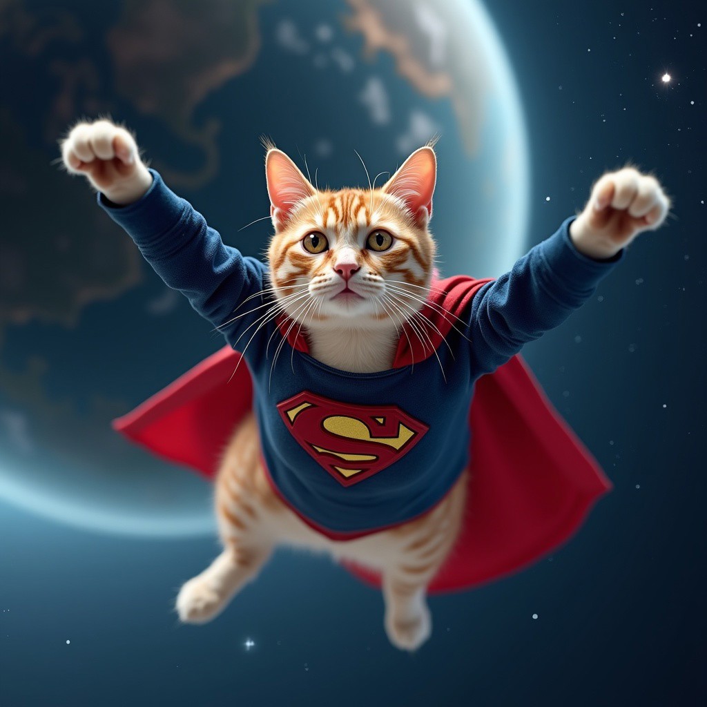 A British cat in a Superman costume is flying up from planet earth. The planet itself is already completely visible in the background, the cat is in space. The view of the cat facing forward. Stars and constellations are visible on the plan behind planet earth, and Captain Marvel is flying somewhere behind.