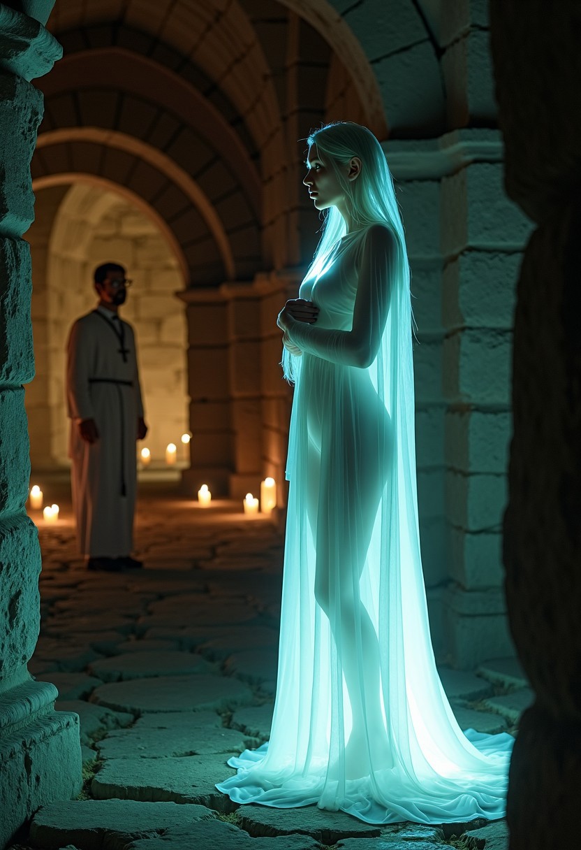An ethereal ghostly woman of striking beauty stands in an ancient Roman church at night, her translucent form faintly illuminated by soft ghostly light. She is draped in delicate, flowing Roman-style robes that reveal the curves of her graceful body. Her face is both beautiful and sensual, with a touch of melancholy. Her body is also translucent, revealing that she isn't entirely present in this world. The church is dimly lit by a few flickering candles, casting shadows across the ancient stone walls. Next to her is the crypt of a knight, her lost love. In the distance, a priest watches in awe, barely illuminated by the ghost’s luminescence. The scene captures the eerie beauty of love and loss in a haunting, serene atmosphere. Roman Clothing, etherial, translucent, church crypt, light reflecting from priest's glasses and the cross around his neck, Style: Surreal, graceful, ethereal, melancholic Lighting: Soft, dim candlelight and ghostly glow Environment: Ancient Roman church, crypt, dark and moody atmosphere Characters: Ghostly woman, crypt of a knight, priest in the background