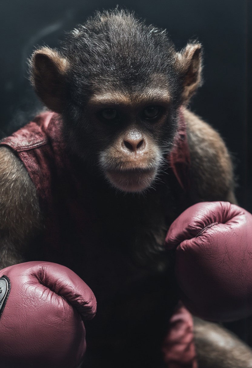A fierce-looking monkey man stands in the center of a dimly lit boxing ring, wearing a sleek, crimson boxing suit with intricate stitching and well-worn pink boxing gloves that hint at previous battles. Its muscles are tense, and its wide, intense eyes burn with determination, ready to strike. The monkey stands in a low, threatening stance, as if preparing to lunge forward with lightning speed. Sweat glistens on its fur, catching the light from overhead boxing ring lamps that cast dramatic shadows on its face and body. The perspective is dynamic, with the monkey appearing mid-motion, as though it's about to leap toward the viewer, creating a sense of action and intensity. The background shows the faint, blurred outlines of the boxing ring ropes and darkened audience seating, giving the setting a gritty, realistic atmosphere with a sense of high-stakes competition,aidmaMJ6.1,aidmaHyperrealism
