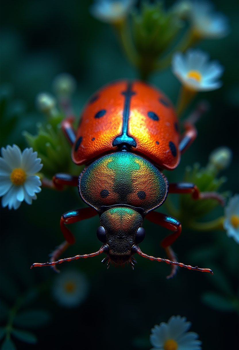 angle from above of a flawless Flea Beetle that embodies the magic of its surroundings with striking colors and intricate patterns adorn its shell that can emit a soft glow and create mini whirlwinds, Winter, Cyber Noir, it is nestled in a lush, vibrant forest filled with glowing flowers, Ethereal Lighting, Film Washi, by Thomas Lawrence, Hajime Sorayama, very inspirational, lush, very, very coherent, highly enhanced, perfect symmetry, glossy, delicate, dynamic background