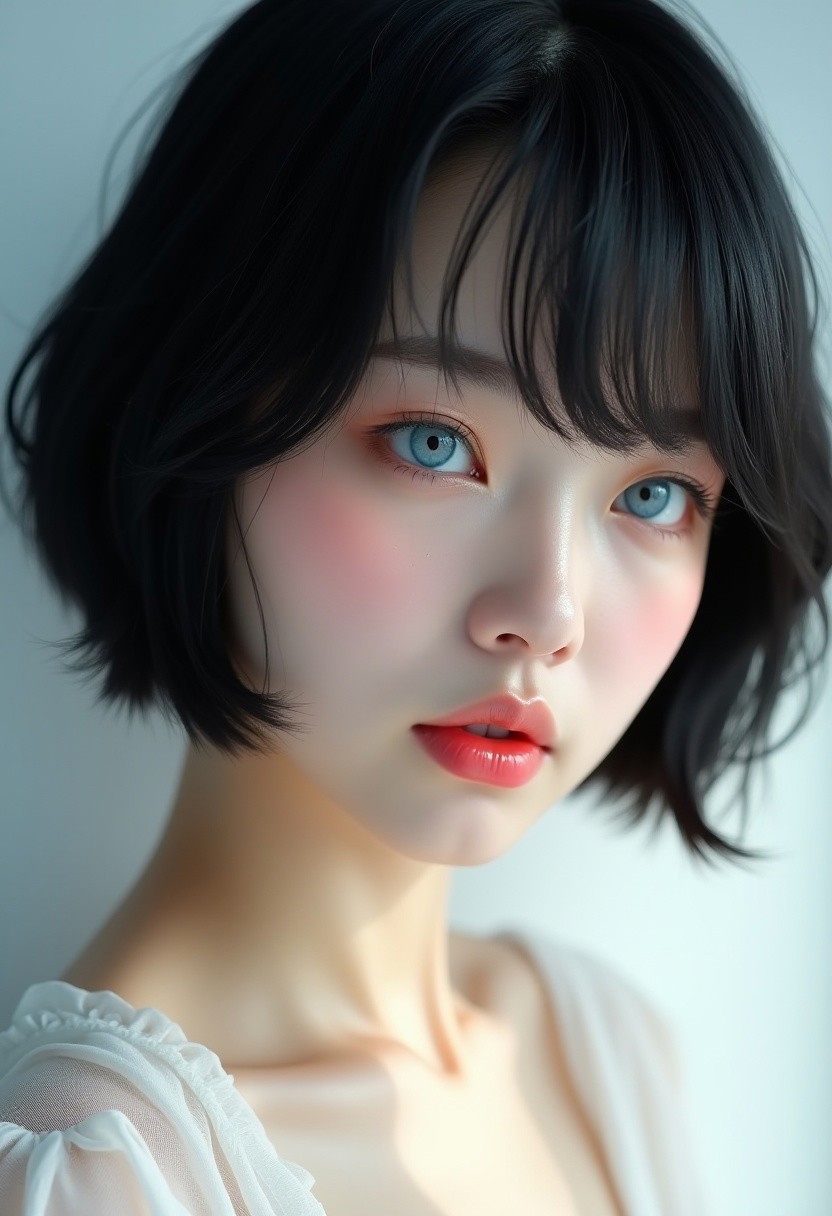 A hyper-realistic close-up of a short haired Japanese woman with shiny black hair with hair over one eye, she is of mixed race, She is half Nordic, and half Japanese, she has pale flawless skin. Her eyes are bright light blue, almost glowing, She has blue eyes. Her lips are a glittering light pink, glossy and perfectly shaped. The background is white, with soft gradients and blurred shapes, creating a dreamy, otherworldly atmosphere, semi-transparent fabric layers that cling to the skin, creating a subtle, realistic shine to the hair, with soft highlights following the natural flow and texture. Add subtle variations in color and thickness for a more dynamic look. soft, glossy texture to the lips, with realistic reflections and subtle texturing to emphasize the natural folds and curves, intricate details to the eyes, with a reflective, slightly glossy sclera and subtle shading to create depth. a delicate eyeliner with a soft wing, blending gently into the lash line to enhance the eyes without overpowering the natural beauty. She is looking away from the viewer. The scene looks like a professional photo shoot. She has diamond earrings on her ears. She's wearing a golden necklace. She has large breasts, and is showing off cleavage.