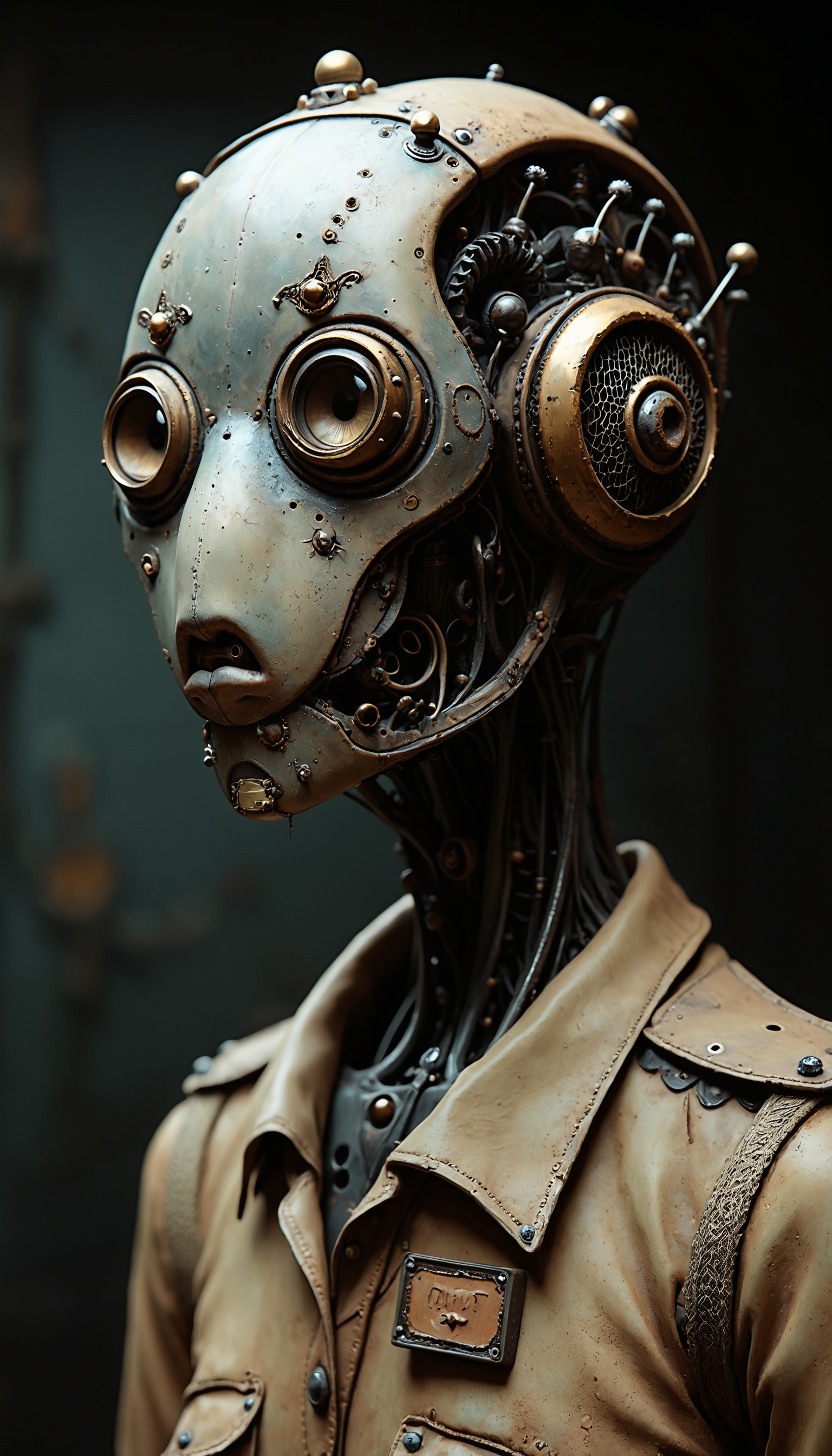 A detailed, steampunk-inspired sculpture of a humanoid robot. The robot's head is intricately designed, featuring large, round, circular eyes and a textured, metallic surface. The color palette consists of earthy tones: browns, grays, and muted blues, creating a vintage and industrial aesthetic. The sculpture's face is detailed, with a neutral expression and a slightly downturned mouth. The humanoid wears a worn-out shirt with a small, rectangular tag attached to the collar. The background is blurred, highlighting the robot as the central subject. The image evokes a sense of mystery and intrigue, as if the robot is in a state of deep thought or contemplation.