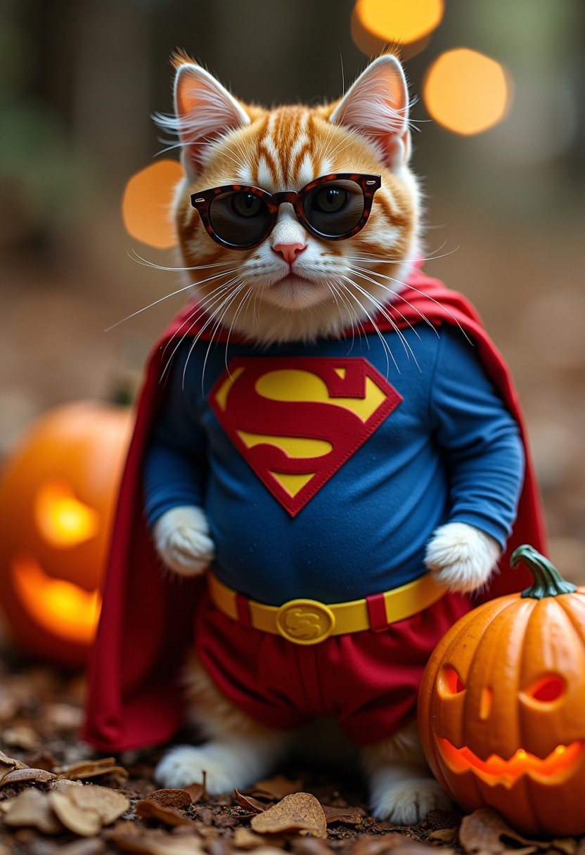 a British cat in round sunglasses and a superman costume, stands like a man, ready-made bales decorated in the style of halloween are on duty next to them, light is eating inside them