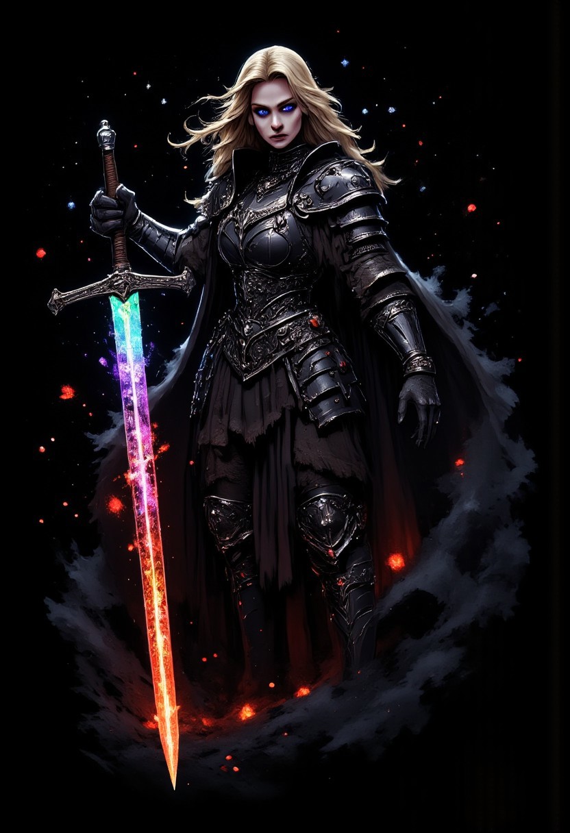 hkstyle, a dark, gothic fantasy style, a stylized semi-realistic, fantasy art style, female knight wielding a pitch black sword made of nebulas and stars wreathed in rainbow flames, black background, sharp image, Perfect hand, Hand