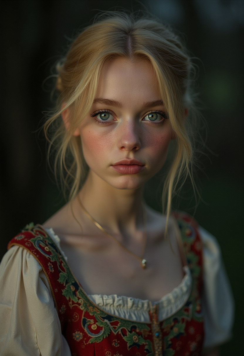 historical setting, bright piercing eyes, , breathtaking Natalie Shau style portrait , 8K, beautiful latvian peasant , folk dress, traditional Latvian attire, poor, background of a village festival , , alluring, innocent, blonde hair, , pale skin, night, low light, sharp focus, studio photo, intricate details, highly detailed,, chin up, looking down, vignette, highly detailed, bokeh, moody, epic, gorgeous, film grain, grainy