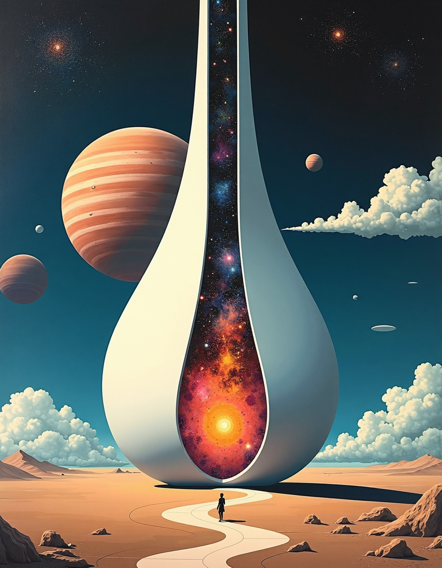 architecture art by Richard Meier and Anni Albers, Surreal cosmic scene, giant teardrop shaped planetary structure split open revealing colorful galaxy inside, small human figure for scale, barren alien landscape background, cosmic clouds in space above, vibrant colors transitioning from cool blues to warm oranges and pinks, highly detailed stellar formations,, Modernist architecture, geometric forms, white structures, Bauhaus textile, geometric patterns, abstract compositions, innovative weaving techniques, exploring texture and materiality, modernist design principles