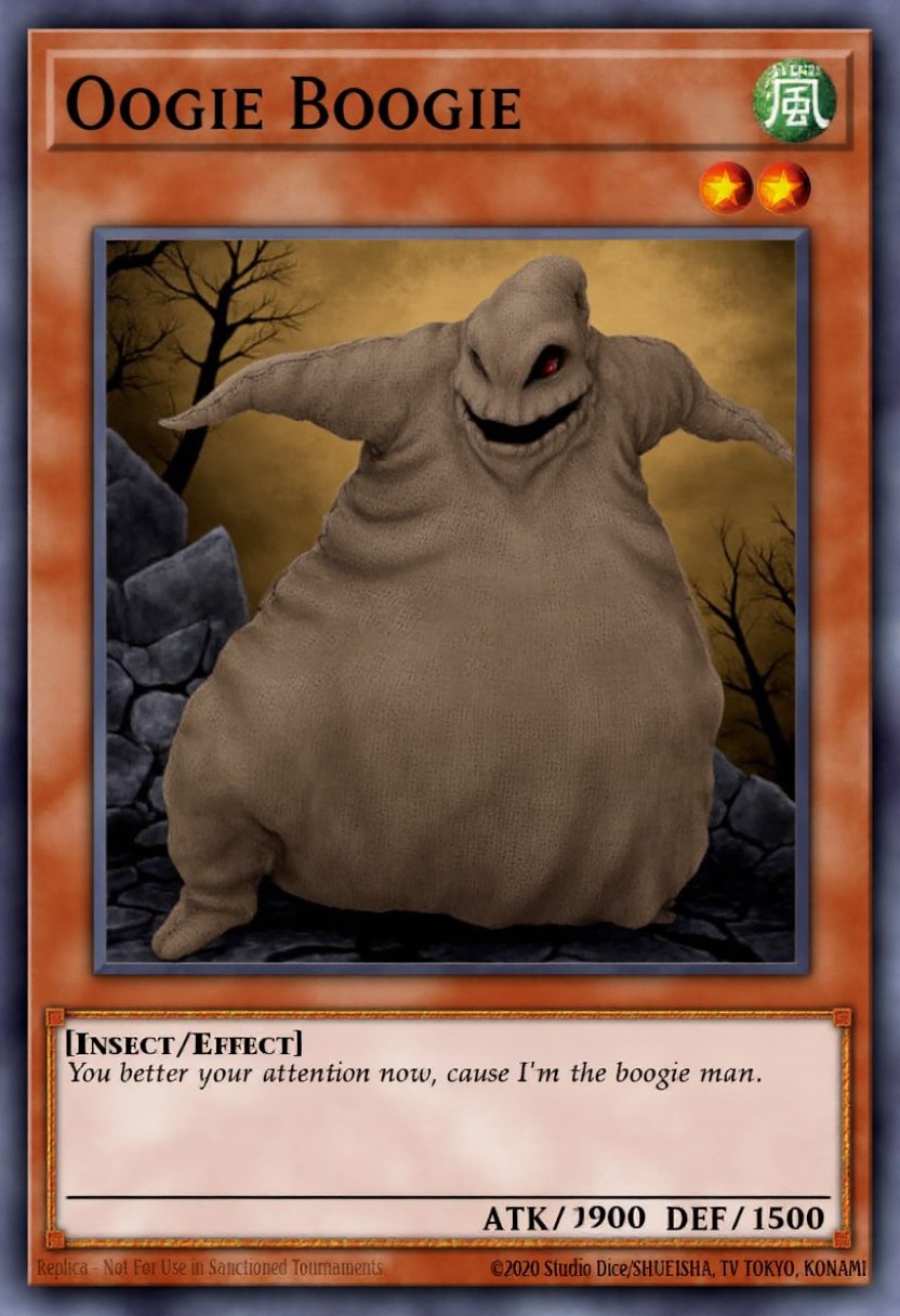 yugioh card "Oogie Boogie", Effect Monster, effect-frame, 9001 ATK, 1500 DEF, Level 8, Race: Insect Sack, attribute: Dark, Card Text:"You better pay attention now, cause I'm the boogie man."., Perfect english text with detailed font, Oogie Boogie, humanoid, burlap sack-like creature, menacing pose