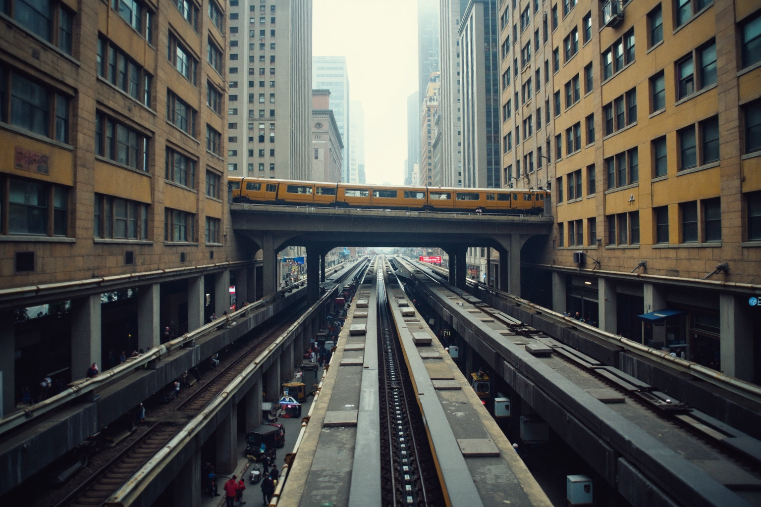 In a bustling city, an imposing network of brutalist train tracks stretches from one building’s window to another, creating a striking visual across the skyline. The heavy, industrial rails emerge from the windows of towering concrete structures, arcing dramatically before disappearing into the windows of adjacent buildings. Trains traverse these robust tracks, moving steadily between the urban giants, while the streets below teem with life, oblivious to the bold railway system overhead. The raw, unrefined aesthetic of the tracks emphasizes the contrast between the gritty urban landscape and the innovative transportation above.
