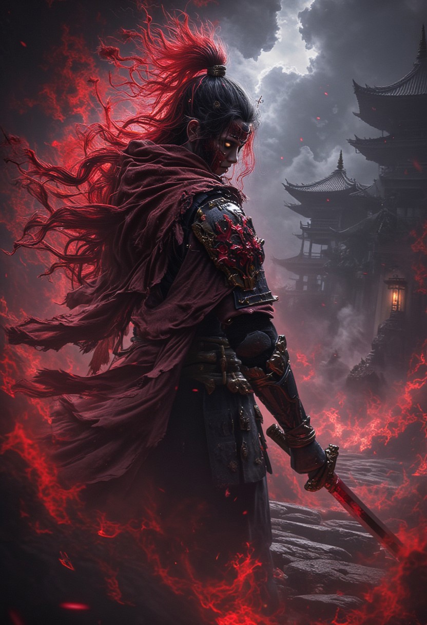 samurai, red armor details, fiery katana, toxic red hair, toxic red color in the entire composition associated with the samurai, everything else is gloomy and inversion in color, the background is a city in inversion color, night, dark atmosphere,