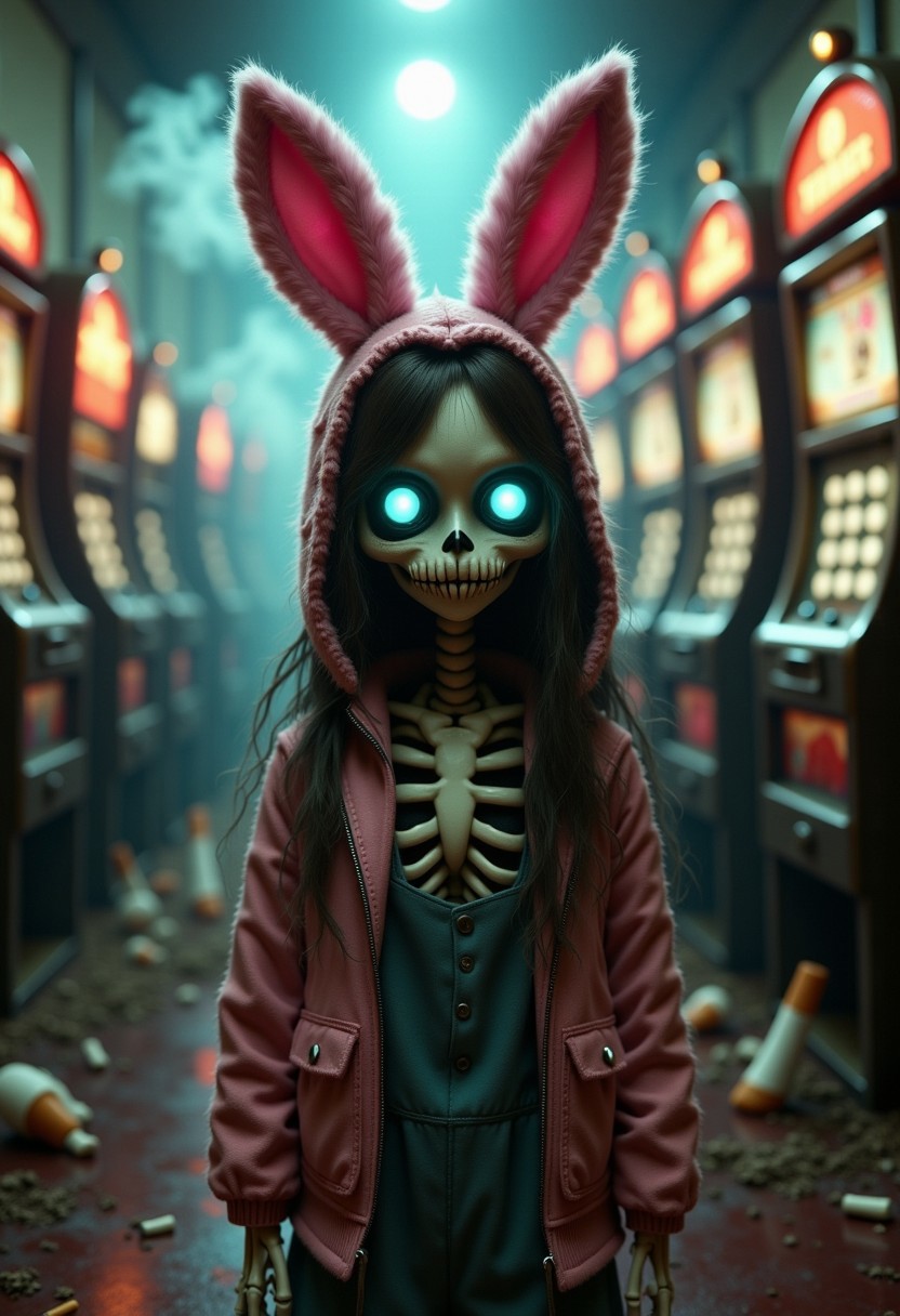 <lora:Spooky Skeletons:1> a skelet0n anthro bunny girl in a bunny suit with fake pink fuzzy ears on her head with a headband, behind her is a casino floor in decay, ashtrays filled with long cigarette butts, spooky misty fog shrouding the corridor of decaying casino machines, dramatic low angle portrait shot, horror, creepy, yet still cute?