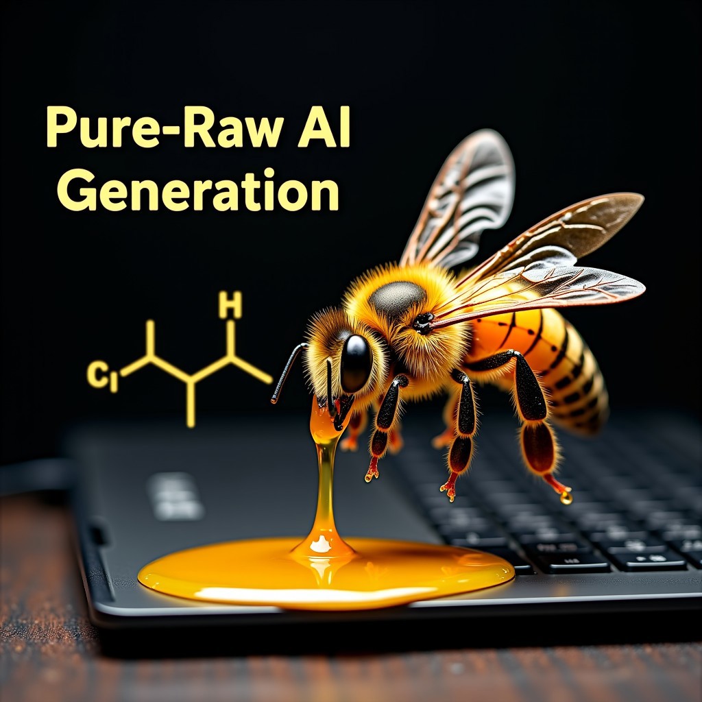 the words Pure Raw AI Generation, A bee pouring honey onto a gaming laptop. Chemical symbols in the background depicting the make up of what the honey is made of.